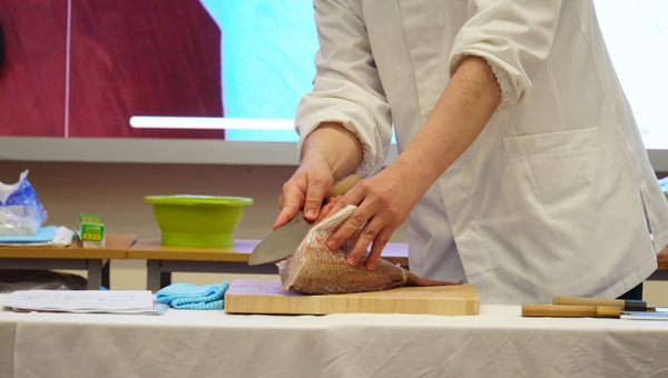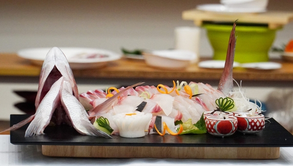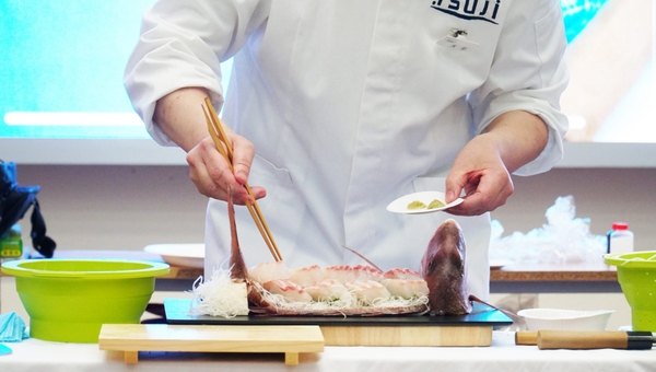 Sau đó là phần trình diễn chế biến Sashimi Nhật Bản của chuyên gia đến từ Trường chuyên môn ẩm thực Tsuji. Những động tác thuần thục, chuyên nghiệp mang đậm tính nghệ thuật trình diễn đã nhận được sự tán thưởng từ các sinh viên.