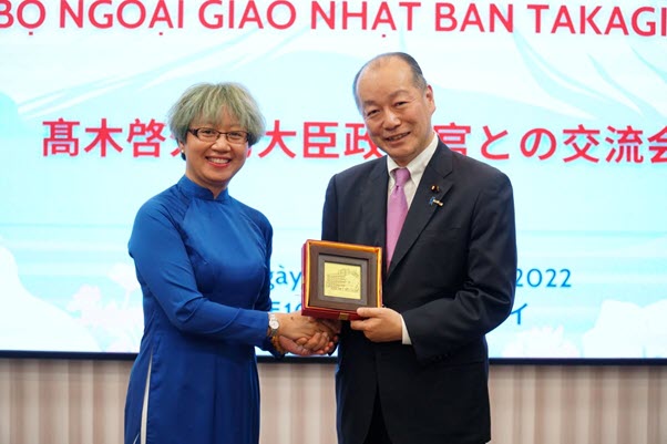 Cô Hà Lê Kim Anh – Phó Hiệu trưởng Trường Đại học Ngoại ngữ trao quà lưu niệm của Nhà trường tới Thứ trưởng Ngoại giao Takagi Kei