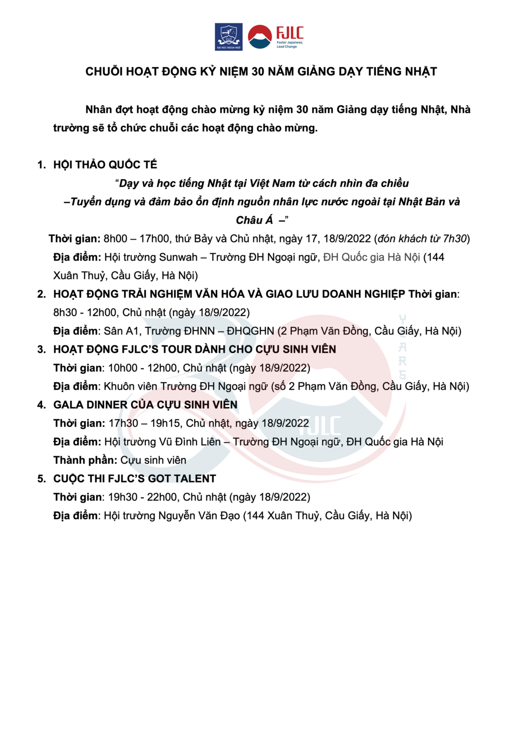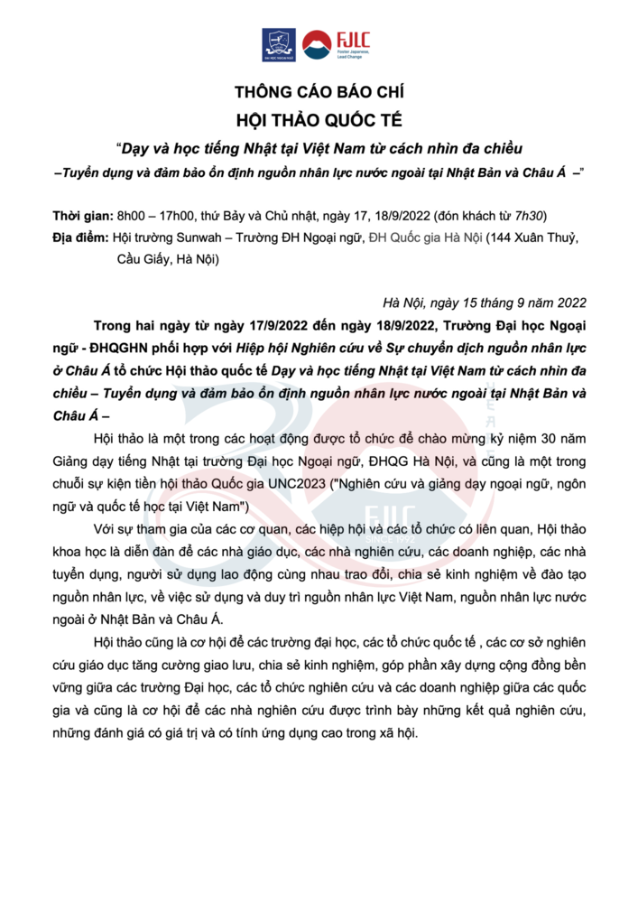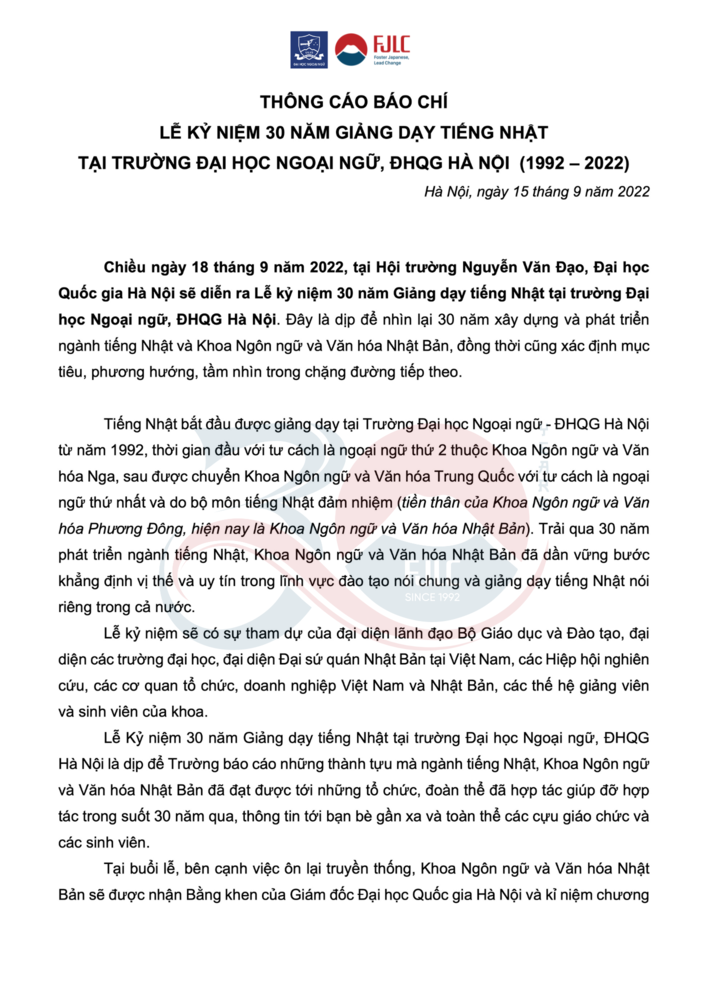 Thông cáo báo chí: Kỷ niệm 30 năm Giảng dạy tiếng Nhật tại trường Đại học Ngoại ngữ, Đại học Quốc gia Hà Nội (1992 - 2022)